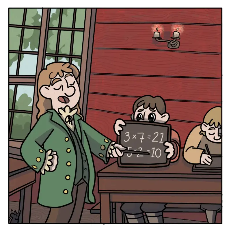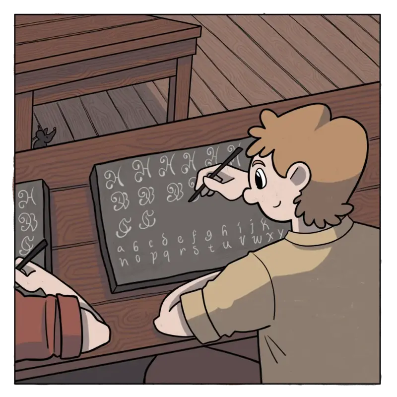 Inn ramler alle drengene. De ler og roper, men med en gang gesellen kommer inn i schøtstuen, blir det musestille. Alle stiller seg opp ved bordene og sier i kor: «God morgen, Hermann!» «Vær så god og sitt», sier Hermann rolig. «Vi tar opp tavlene og griflene våre. I dag begynner vi med regning.» «Hurra! Regning!», hører Hans under tyskboken. Han løfter litt på boken og ser hardt på Rattus. «Du må være stille!», hvisker han. «Ellers kan du ikke være her! Hei! Ikke spis på griffelen min! Da har jeg ikke noe å skrive med!» Rattus, som akkurat skulle til å sette tennene i den lange skiferpinnen, gir den motvillig fra seg. «Jaja. Skiferstein er ikke så godt uansett. Si fra hvis du trenger hjelp til svarene, da! Regning er det beste jeg vet!»