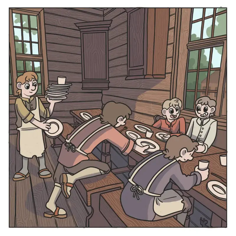 Denne morgenen våkner Hans tidlig. Han har både gledet og gruet seg til denne dagen: Hans første skoledag her på Bryggen! Men først må han gjøre unna alle morgenoppgavene. Han hopper ut av køyen og stikker beina inn i skoene sine. Først må han til brønnen og hente vann. Det er iskaldt ute, så kaldt at når Hans senker bøtten nedi brønnen, brister et tynt islag før han kan heve den fulle bøtten opp igjen. Det er mye de trenger vann til, så han går mange ganger med de tunge bøttene. Etterpå henter han ved, så de får fyrt opp skikkelig i ildhuset. Siden det skal være skole i dag, må schøtstuen på den andre siden av veggen være god og varm, så han legger i noen ekstra kubber i bileggerovnen også. Den ovnen er ordentlig lur, for den har dører som kan åpnes både fra ildhuset og fra schøtstuen. I ildhuset er de andre stuedrengene allerede i full gang med å lage frokost, og Hans skynder seg å skifte til treskoene de må ha på der inne.