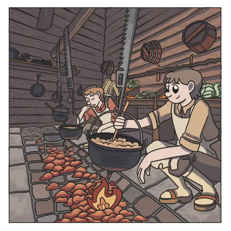 Det er fryktelig strengt med de skoene. En dag var det en av de andre stuedrengene som glemte seg, og gikk ut av ildhuset med treskoene på. Da skjedde det som ikke må skje: En liten glo hadde festet seg under sålen, og nå lå den på tregulvet ute i bryggegangen og ulmet og glødet. Det kan bli storbrann av sånt! Alle på Bryggen er livredde for brann, for det har skjedd mange mange ganger. Heldigvis kom en av skutedrengene forbi med en tralle full av varer, og han skyndte seg å tråkke på gloen så den sluknet. Selv om dette var et uhell, og det gikk bra, fikk den stakkars stuedrengen som hadde glemt å skifte sko en streng straff: Fem harde slag over ryggen med oksepeisen.