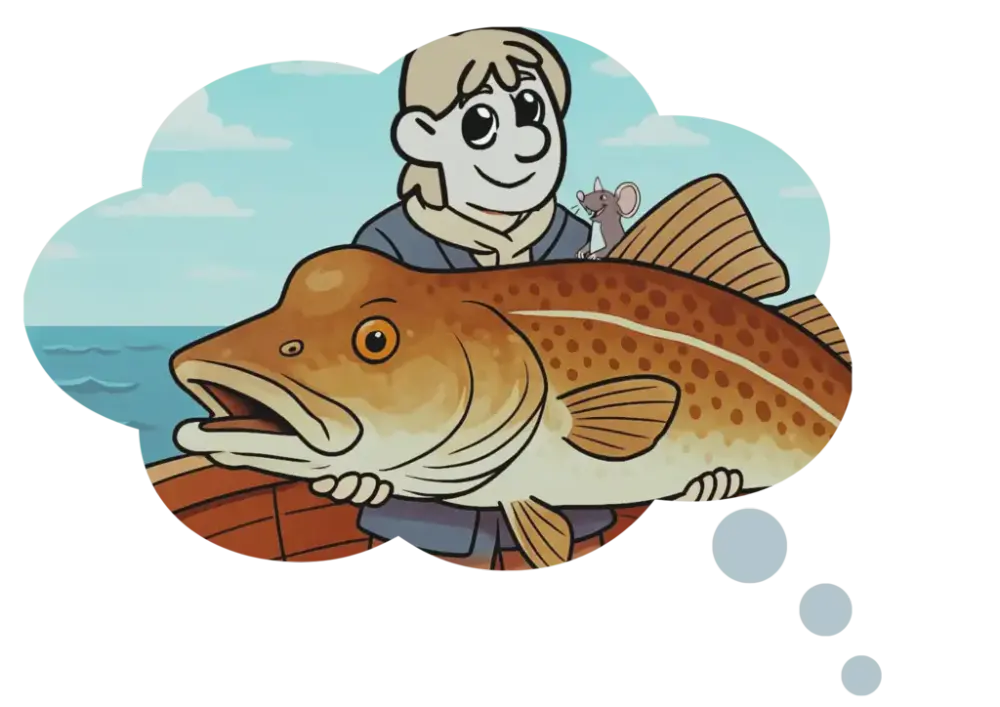 «Jepp!», nikker Rattus ivrig og hopper rundt på brystkassen hans. «De sier at den som får en sånn, får lykke med seg. Og hodet til torsken peker mot vinden. Hvis det snur mot nord – blir det kaldt. Snur det mot sør – da kommer fisket.»