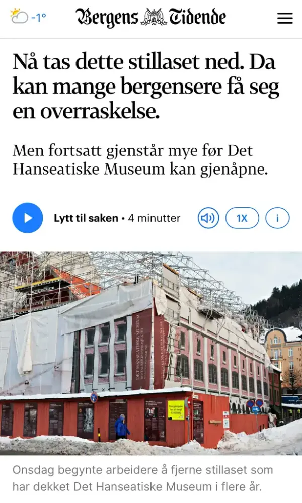 Presenninger og stillaset rundt Det Hanseatiske Museum i Bergen blir nå fjernet etter nesten fire år.
