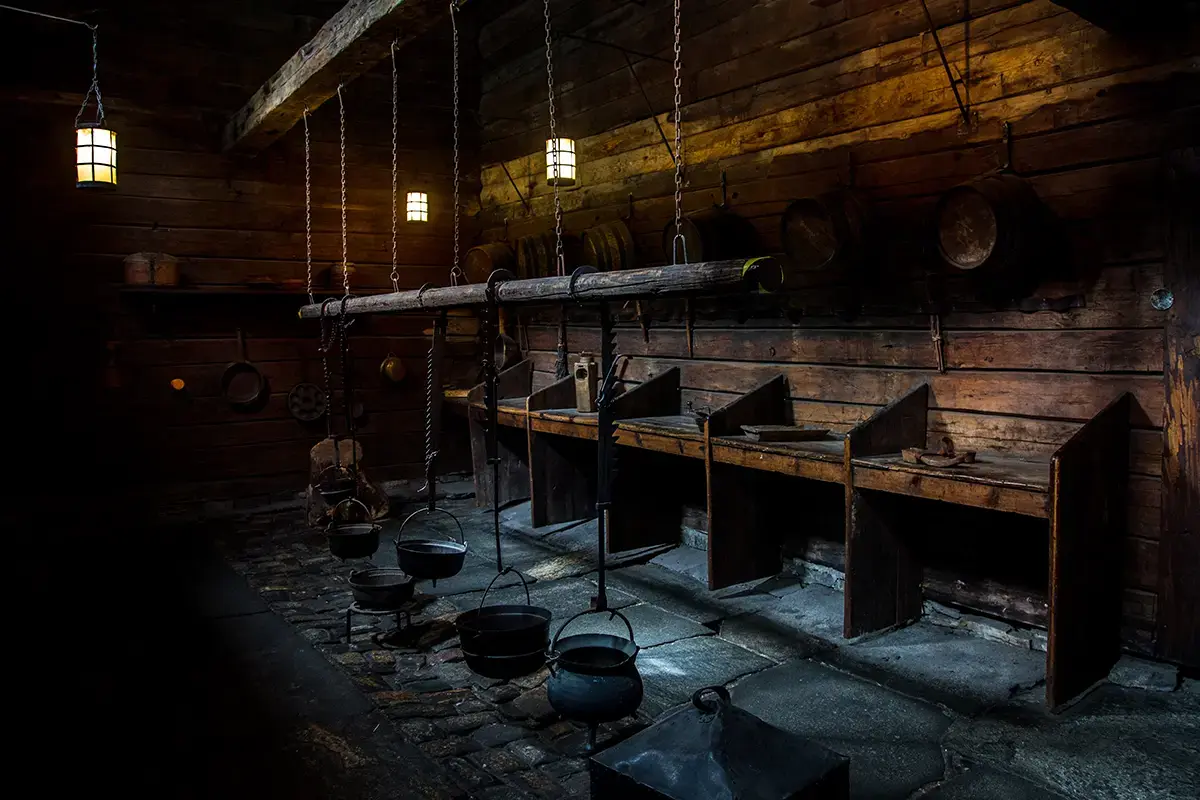 Parts of this cook house was left at Bryggen, and was used to reconstructed the room at Schøtstuene. / Deler av Bredsgårdens ildhus sto igjen på Bryggen, og har blitt rekonstruert på Schøtstuene med kappen (hvit mur). Ingvild Festvoll Mellien | Stiftelsen Museum Vest